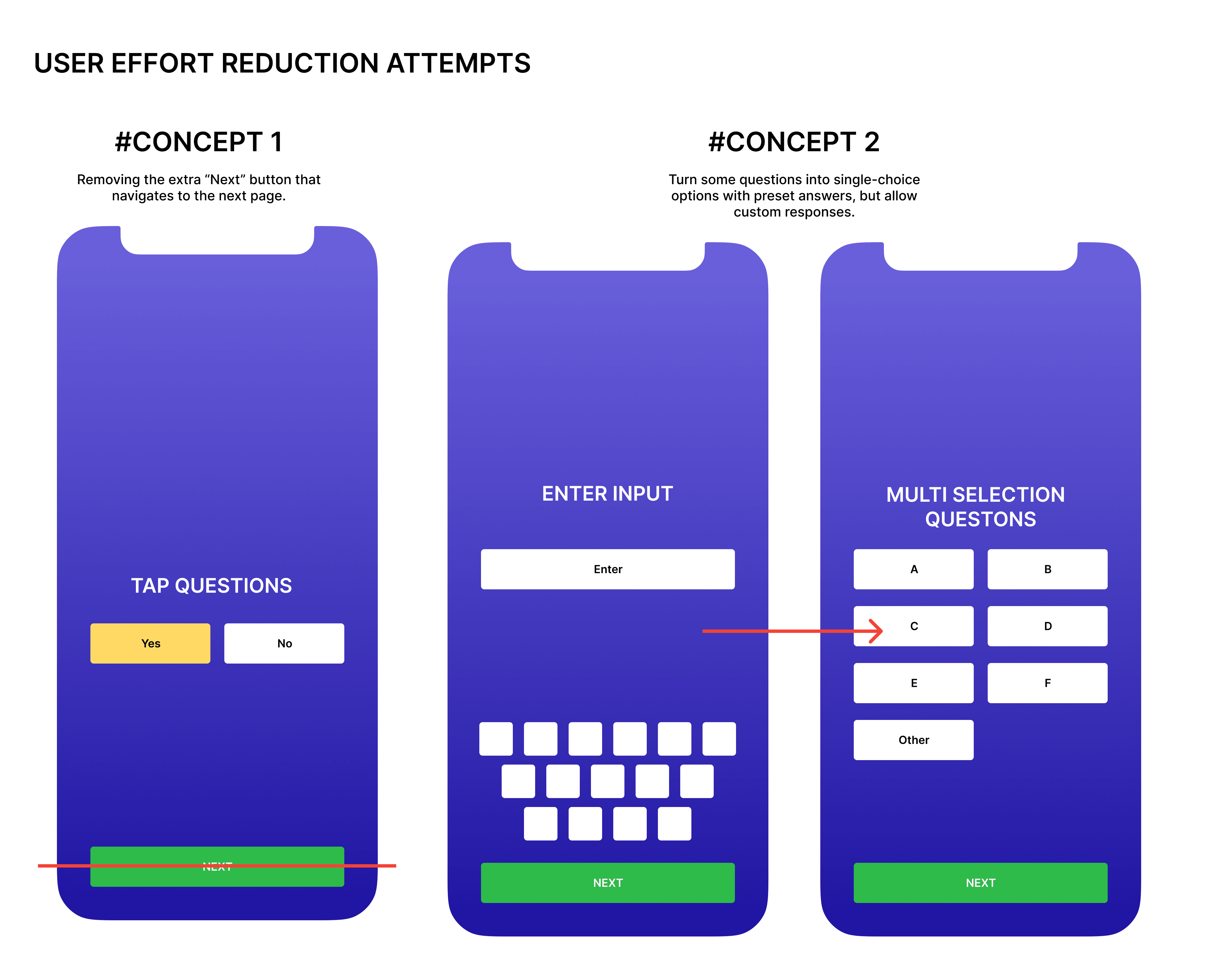 I began by exploring ways to reduce the number of actions in the questionnaire. The first idea was to remove the "Next" button, which users had to click after each question. This change would automatically cut down on the number of taps required, making the process smoother.